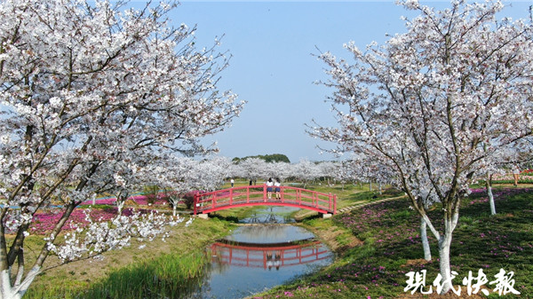 這兩天,鎮(zhèn)江句容白兔鎮(zhèn)伏熱花海里,大片大片的櫻花燦然盛開,以一樹的浪漫迎接四方游客。