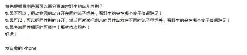 如何幫助這對隔籠相望的 “愛情鳥”?南通森林野生動物園向社會發(fā)布求助信,希望借助專家和網(wǎng)友的力量,讓這對“小情侶”最終能走到一起。