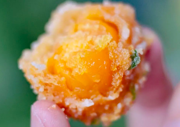 咸蛋黃愛好者的福音。一顆顆剔透光亮的咸蛋黃包裹著輕薄的面衣下鍋,炸至酥脆后拌入熱騰騰的糖漿,最后再佐以蔥花點(diǎn)綴。咸甜油香,口感口味層次都很豐富,一定要趁熱吃。