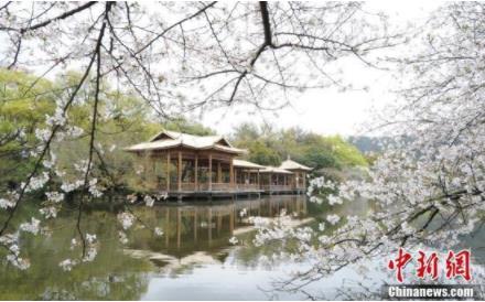 江南春日,浙江杭州西湖花港公園、太子灣公園等地櫻花進入最佳觀賞期,唯美之景,引人流連。圖為杭州西湖花港公園亭廊前櫻花盛開。