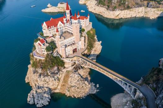 通過無人機航拍可以看到這座城堡的全貌,它建在萬峰湖的一座孤島上,四面環(huán)水,僅有一座拱橋連接著湖岸,供人們進出城堡。