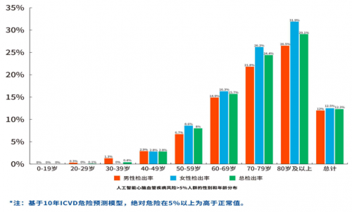 針對心腦血管疾病風(fēng)險>5%的評估中,檢出率為12.3%;其中男性占比37.3%,女性占比62.7%。
