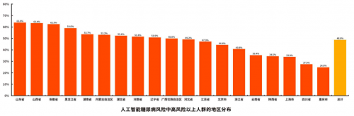 從地區(qū)分析來看,糖尿病高風(fēng)險與中高風(fēng)險的檢出率基本上呈“北高南低、東高西低”的分布特征,與糖尿病患病率的地區(qū)分布相符。在納入統(tǒng)計(jì)的19個省級行政區(qū)中,山東省、山西省、安徽省占據(jù)前三名,中高風(fēng)險以上檢出率分別為63.9%、63.4%、62.5%;重慶市、四川省、上海市占據(jù)末三名,中高風(fēng)險以上檢出率分別為24.8%、27.5%、33.9%。