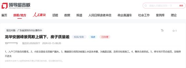 人民網(wǎng)深圳3月22日電(陳育柱、曹歡慶)近日,有多位深圳市民通過人民網(wǎng)“領導留言板”反映,龍華區(qū)人才房“安居峰景苑”質(zhì)量存在諸多問題。目前,龍華區(qū)已成立專項處置工作組。
