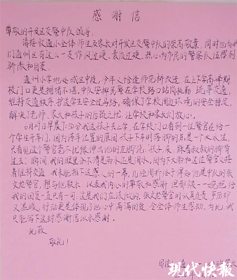 現(xiàn)代快報記者了解到,寫下感謝信的衛(wèi)女士,是通州小學(xué)一年級學(xué)生的家長。這所小學(xué)位于城區(qū)中部,上下學(xué)高峰期時人流量較大,每天都有護學(xué)崗的民警在現(xiàn)場執(zhí)勤維持秩序。