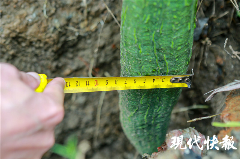 這根絲瓜瓜柄處直徑為2公分,最粗處達8公分。“種了7年桃子地,桃園里還是頭一次長出這么長的絲瓜。”桃園主人陳棟健告訴記者,這根“絲瓜大王”長速驚人,“前一周還是測量還是1.95米。今天已經(jīng)長到2.17米了,真的和現(xiàn)役國家隊中鋒周琦一樣高了。”