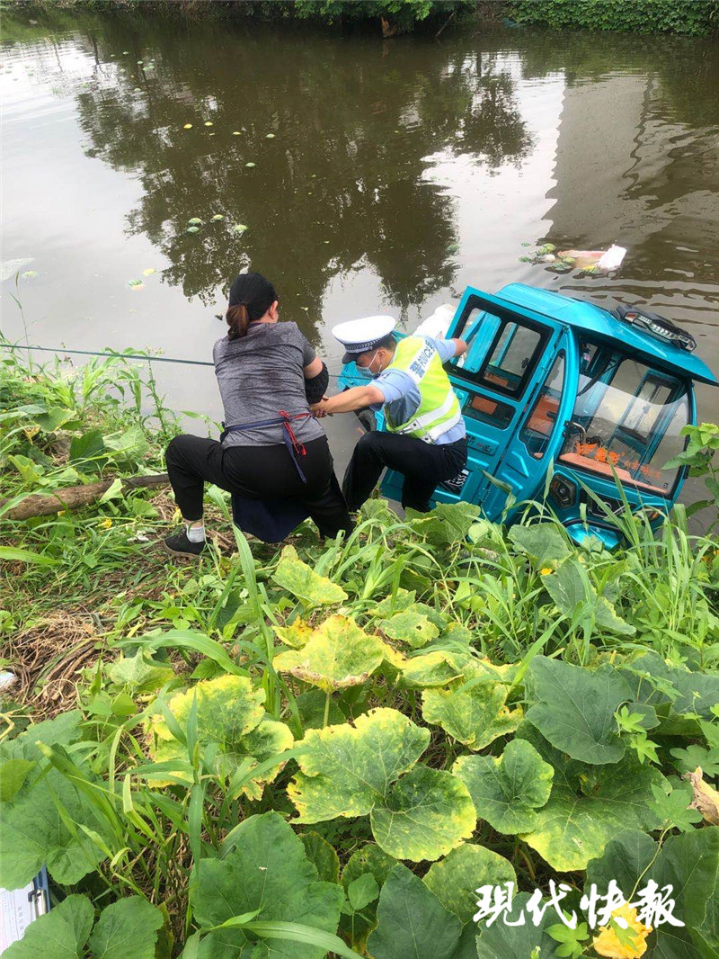接到指令后,海門市公安局包場派出所交警中隊民警錢清鋒火速趕往事發(fā)地。到達(dá)現(xiàn)場后,錢清鋒發(fā)現(xiàn)一輛藍(lán)色的電動三輪車側(cè)翻在河中,大半個車身已經(jīng)被河水淹沒,駕駛員腿部被牢牢卡在車內(nèi)無法動彈。幸虧附近群眾發(fā)現(xiàn)及時,一名穿保安服的男子將一根尼龍繩拴在三輪車上,然后幾名群眾合力在岸上拉住繩子,防止三輪車?yán)^續(xù)下滑。