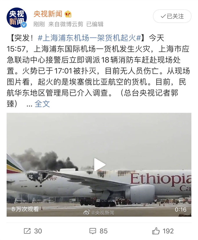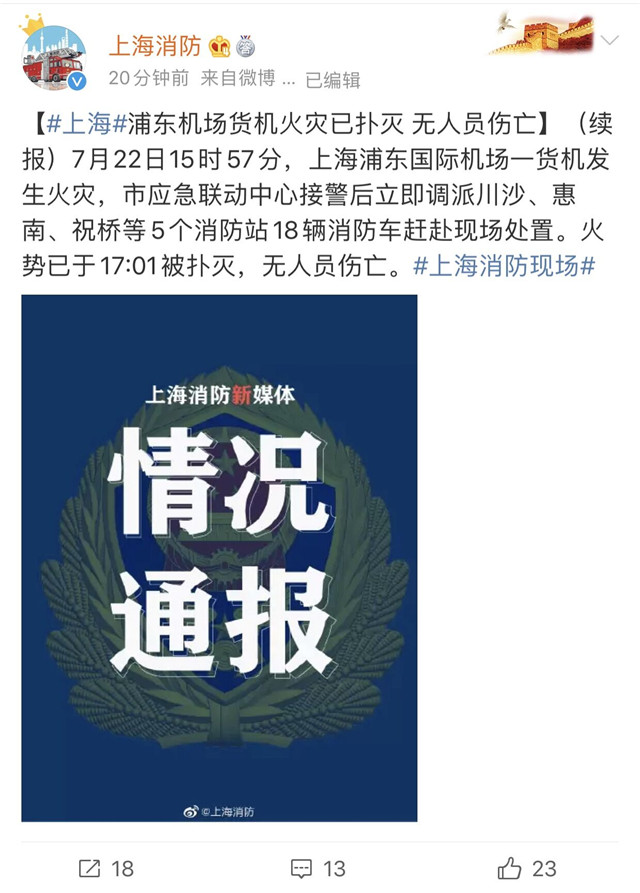 當(dāng)天下午,“@上海消防”發(fā)布稱,7月22日15時(shí)57分,上海浦東國際機(jī)場一貨機(jī)發(fā)生火災(zāi),市應(yīng)急聯(lián)動(dòng)中心接警后立即調(diào)派川沙、惠南、祝橋等5個(gè)消防站18輛消防車趕赴現(xiàn)場處置?;饎菀延?7:01被撲滅,無人員傷亡。