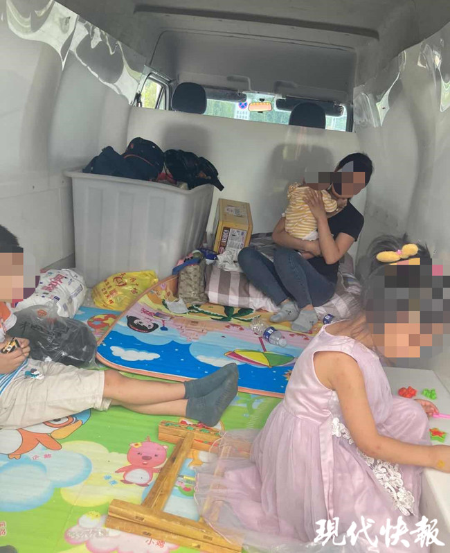 民警檢查發(fā)現(xiàn),除司機趙某和四位成年乘客以外,其余5人均為兒童,包括一名不足三月的嬰兒。并且,該車后排座椅被全部拆除,用擋板隔起,還鋪設了地墊,小孩們在車廂里席地而坐,儼然成了一個“兒童樂園”。