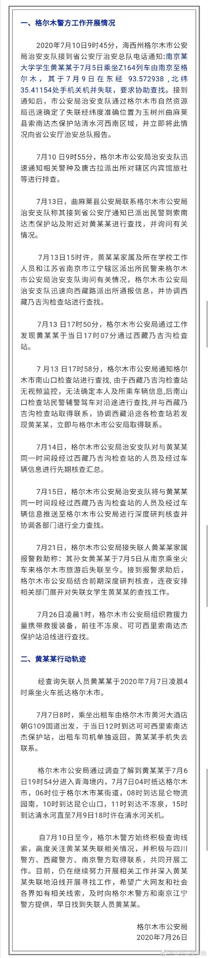 青海格爾木警方通報(bào)“南京一女大學(xué)生失聯(lián)”情況
