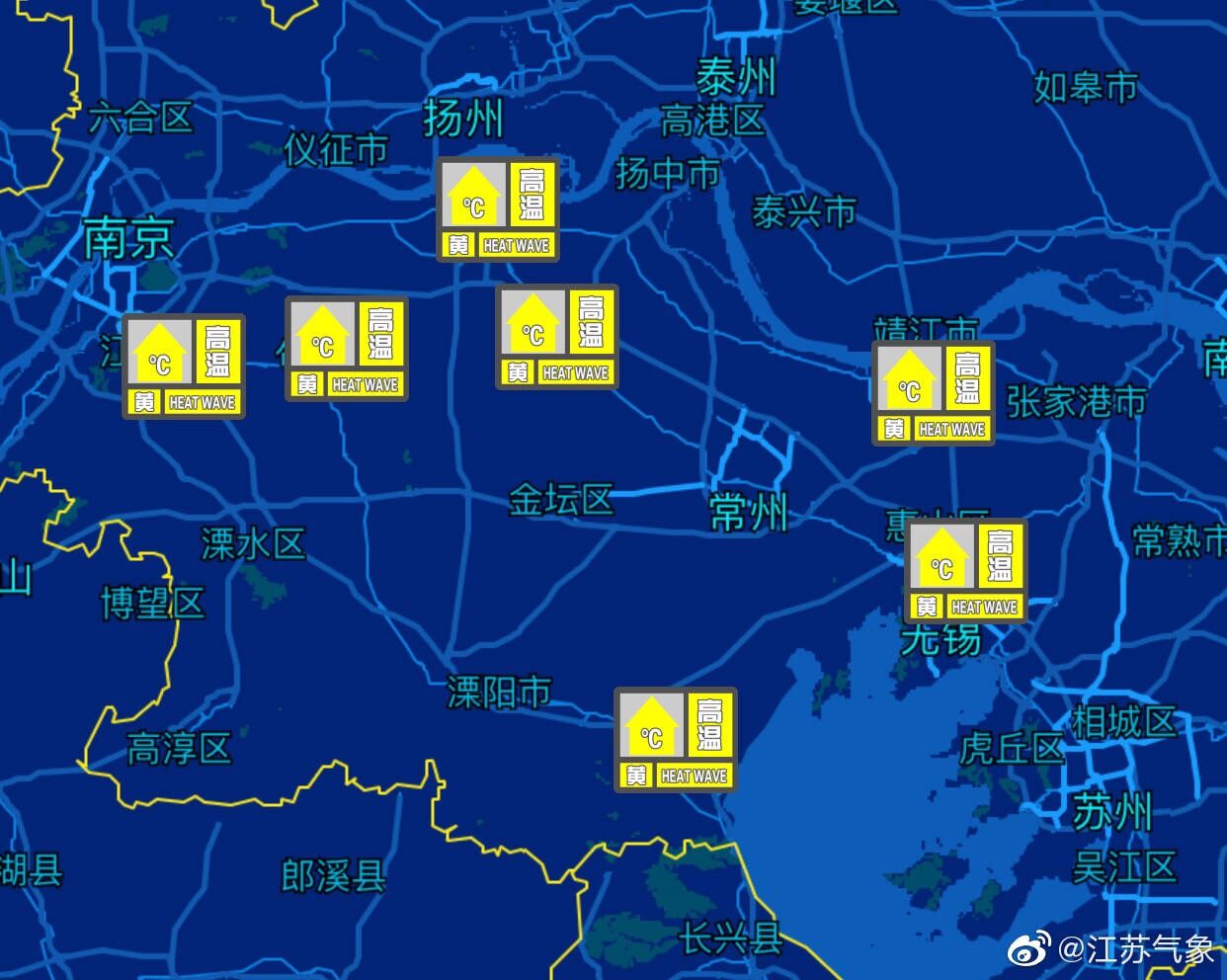 江蘇省氣象臺也于9時22分發(fā)布高溫黃色預警信號:預計南京、蘇州、無錫、常州、鎮(zhèn)江、揚州、泰州、南通地區(qū)未來連續(xù)三天最高氣溫將達35℃到36℃,提醒大家注意防范。