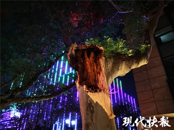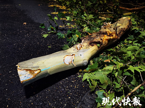 現(xiàn)代快報(bào)記者趕到現(xiàn)場時,看到公交車停在道路中間,一根直徑約30厘米的樹干擋在車頭前方,公交車的擋風(fēng)玻璃、車燈位置有不同程度的損壞,車上沒有乘客。記者注意到,該樹干是從道路旁一棵法桐上掉下來的,樹干撕裂處有腐爛現(xiàn)象。