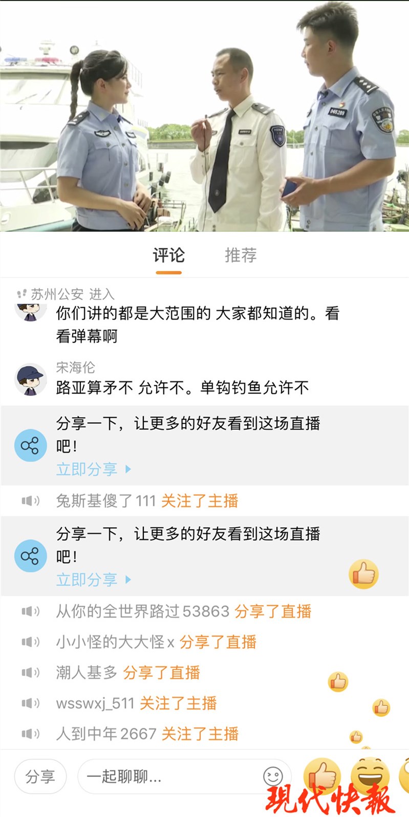 8月4日,江蘇省公安廳新聞宣傳中心、蘇州市公安局新聞宣傳中心聯(lián)合開啟直擊長江禁捕第一線直播。直播中請來了一名嘉賓,他就是蘇州市公安局水警支隊民警許冬。他為大家解答了相關(guān)政策法規(guī)、禁捕水域范圍、“三無船舶”查處等相關(guān)熱門問題。