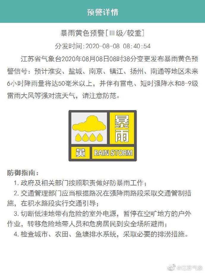 現(xiàn)代快報記者了解到,8月7日起至8月8日早晨,副高北側(cè)雨帶向南壓,強降雨主要出現(xiàn)在河南南部,安徽北部,江蘇北部一帶。隨后,江蘇沿江地區(qū)出現(xiàn)短時強降水、雷雨大風(fēng)等對流天氣,浦口單小時雨量超50毫米!江蘇省氣象臺于8時38分變更發(fā)布暴雨黃色預(yù)警信號。預(yù)計淮安、鹽城、南京、鎮(zhèn)江、揚州、南通等地區(qū)未來6小時降雨量將達50毫米以上,并伴有雷電、短時強降水和8-9級雷雨大風(fēng)等強對流天氣。淮安、南京、揚州、南通、蘇州等地也紛紛發(fā)布雷暴黃色預(yù)警,全省各地58條預(yù)警霸屏。