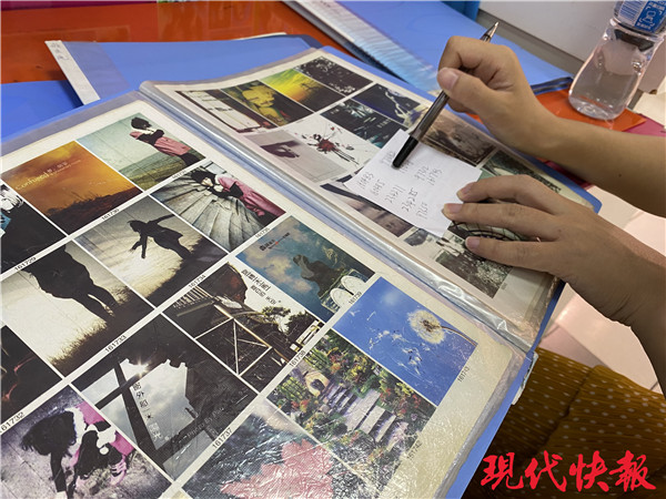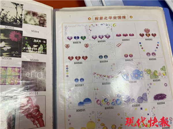 8月5日,經(jīng)過一番搜索,現(xiàn)代快報記者在玉橋商業(yè)廣場找到了這個小店,面積不足5平方米。見有客來,老板馬上招呼在門口的椅子上坐下,隨后拿出來一摞文件夾,每一冊里都裝滿了各式各樣的畫框、背景。“這是紙和筆,選好喜歡的圖案把編號寫下來。”翻一翻,既有愛情摩天輪這種情侶必選的元素,也有心形云朵這種小清新必備,還可以選擇和周杰倫、張含韻等明星“合照”,畫冊里的張含韻還是十幾年前圓乎乎的嬰兒肥。