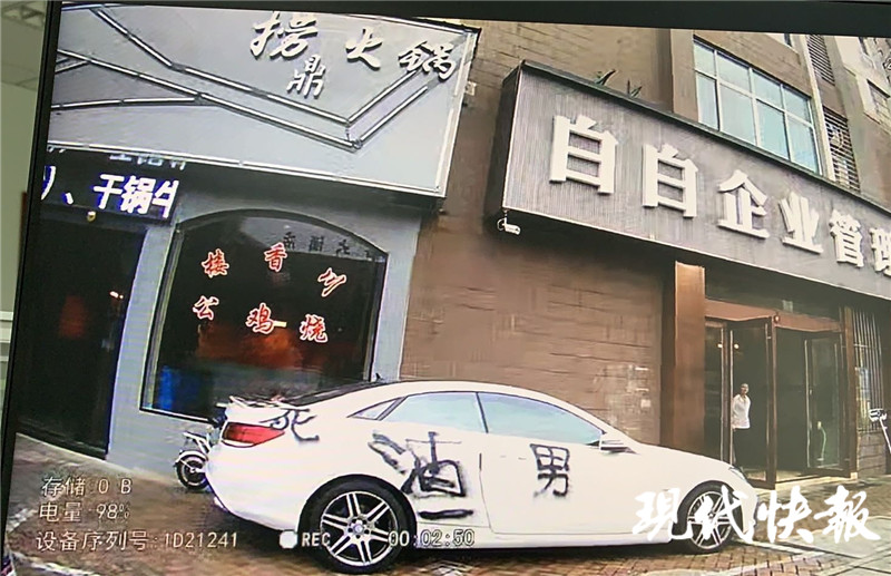 現(xiàn)代快報記者了解到,7月23日,男子小李將私家車停在一火鍋店門口,可當(dāng)他回來取車時發(fā)現(xiàn),車上竟然被噴了黑油漆,寫著“渣男”“劈腿”等字樣。走近一看,車身上還被多處刮傷。小李趕忙報了警。蘭陵派出所民警接到報警后立即趕往現(xiàn)場,調(diào)取了街邊的公共視頻看到,劃車、涂鴉的是一個年輕女子。