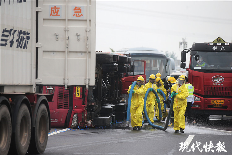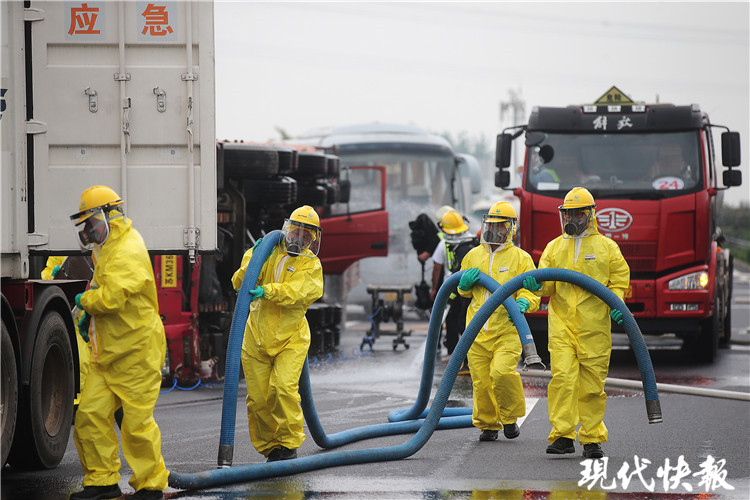 上午9點(diǎn),隨著現(xiàn)場(chǎng)總指揮的一聲令下,演練正式拉開帷幕。演練事故場(chǎng)景設(shè)定為,8:55在蘇皖交界往天長(zhǎng)方向K270+500處,一輛?;凡酃捃嚢l(fā)生側(cè)翻事故,引發(fā)后方大客車和貨車追尾,?;芬伤瓢l(fā)生泄露,現(xiàn)場(chǎng)半幅交通中斷且有人員受傷。接現(xiàn)場(chǎng)事故報(bào)告后,高速交警、交通執(zhí)法、高速公路經(jīng)營(yíng)管理單位等“一路多方”立即響應(yīng),第一時(shí)間按相關(guān)要求核實(shí)高速公路?;愤\(yùn)輸車交通事故信息,迅速啟動(dòng)《江蘇省高速公路重特大交通事故及?;肥鹿侍幹妙A(yù)案》和《高速公路省際聯(lián)動(dòng)協(xié)作機(jī)制》,并立即通知安徽和揚(yáng)州的應(yīng)急管理、環(huán)保、消防、通訊、急救、社會(huì)救援等“一路多方”前往現(xiàn)場(chǎng)開展救援。