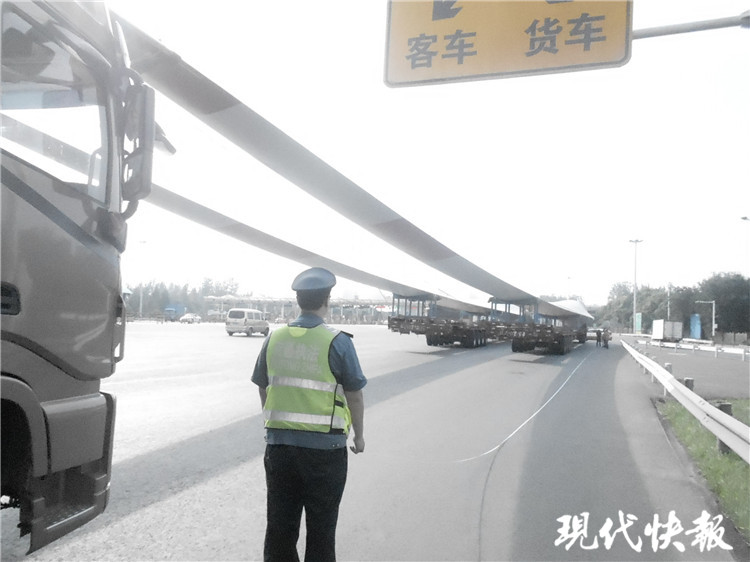 (通訊員 寧交執(zhí) 記者 李娜)8月11日下午3點(diǎn)多,在南京大勝關(guān)大橋主線收費(fèi)站附近,3輛遼B牌照、車貨總長(zhǎng)均達(dá)68米的“巨無(wú)霸”貨車排成一條“巨型長(zhǎng)龍”躊躇不前,場(chǎng)面頗為壯觀。