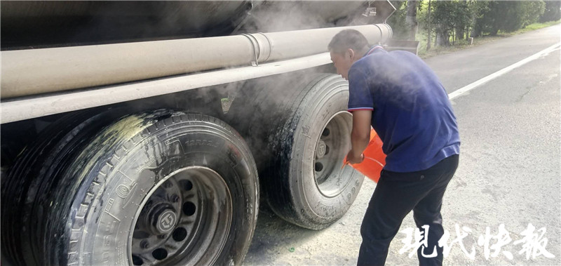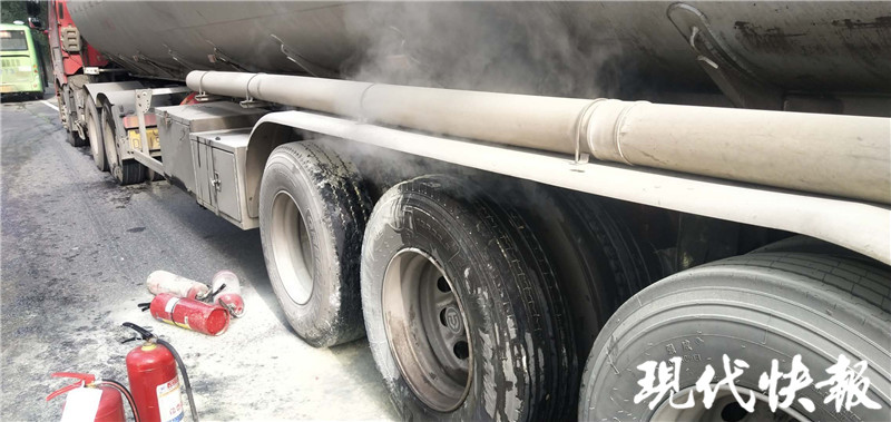 滿載汽油的油罐車輪胎起火 兩位大巴司機(jī)舍命撲救