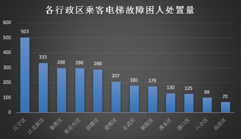 從各區(qū)來看,上半年乘客電梯故障困人發(fā)生次數最多的是江寧區(qū),共503起。專家分析,主要是因為江寧區(qū)是電梯總量多、住宅電梯多、老舊電梯多的區(qū)之一。江寧區(qū)泰西路28號泰來苑83棟1單元同一電梯上半年發(fā)生6起困人故障,為全市最多。