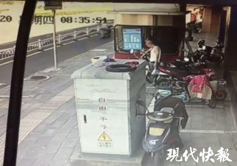 交警調(diào)取了公共視頻發(fā)現(xiàn),下“黑手”的是一名中年男子。在公共視頻中,只見8月13日上午8點35分至8點38分期間,一身穿背心的男子經(jīng)過交警崗?fù)?,觀察了一會后,在警摩附近逗留了3分多鐘,先是從褲袋里掏出了東西后在警摩旁逗留了好一會,接著又從地上撿起了東西走到了另外一輛車邊下手,最后還從崗?fù)み吷夏米吡艘粋€拖長線的物品:正是充電器。