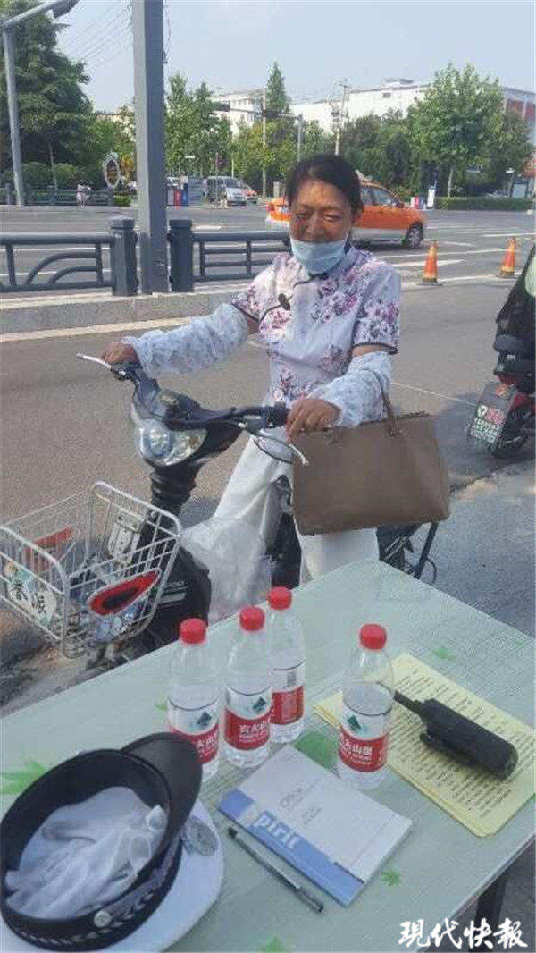 同樣感人的一幕還發(fā)生在灌南縣人民橋沿線路口。8月17日下午,一位穿著中式碎花短袖的阿姨,騎著電動車帶著一扎礦泉水,一路從蘇州路口往西行駛。每到一個執(zhí)勤點,就熱心地送上幾瓶水。“看你們臉曬的通紅,每一個做父母的,都會心疼。多喝點水,別熱壞了。”她說,這幾天正是天氣最熱的時候,人們都待在家里盡量不出來,但交警依然冒著酷暑在戶外工作,連個遮陽的地方都沒有,很是心疼,于是她就買了一扎礦泉水,在回家的沿途分給執(zhí)勤交警,提醒他們多喝水,別中暑。