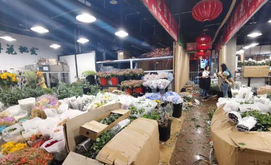 8 月 23 日中午,現(xiàn)代快報記者來到漢中門鮮花批發(fā)市場,在二樓鮮花批發(fā)專區(qū)看到滿地被剪落的鮮花枝葉,還有凌亂的包裝紙盒,幾位清潔人員正在打掃清理。原本就不太寬敞的過道,被兩邊商家擺放的各種鮮花占得更狹窄。