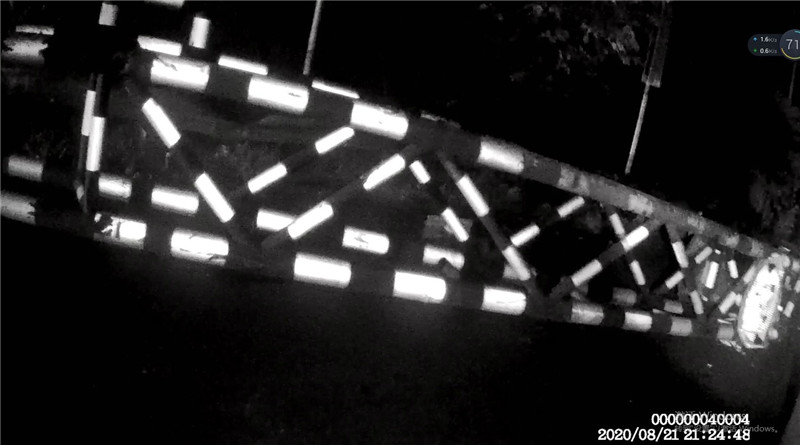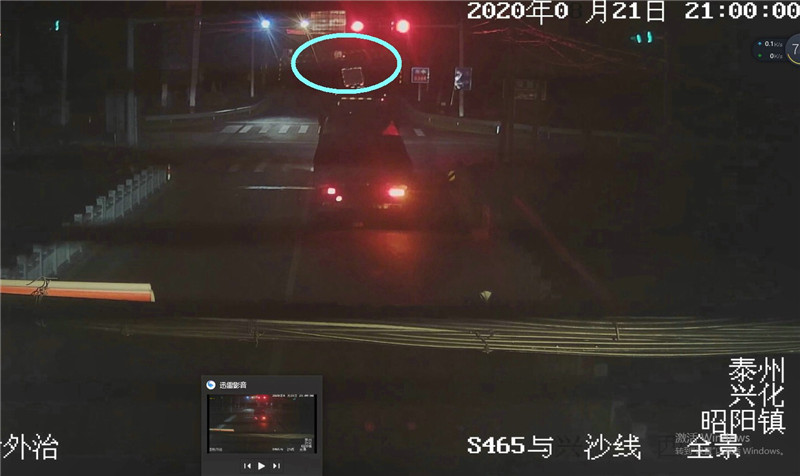 8月21日晚,在周奮加油站前的紅綠燈處,來往車輛正在有序通行。從路邊公共視頻探頭可以看到,在紅綠燈東側(cè)路口,為了限制貨車通行,設(shè)置了一個限高龍門架。