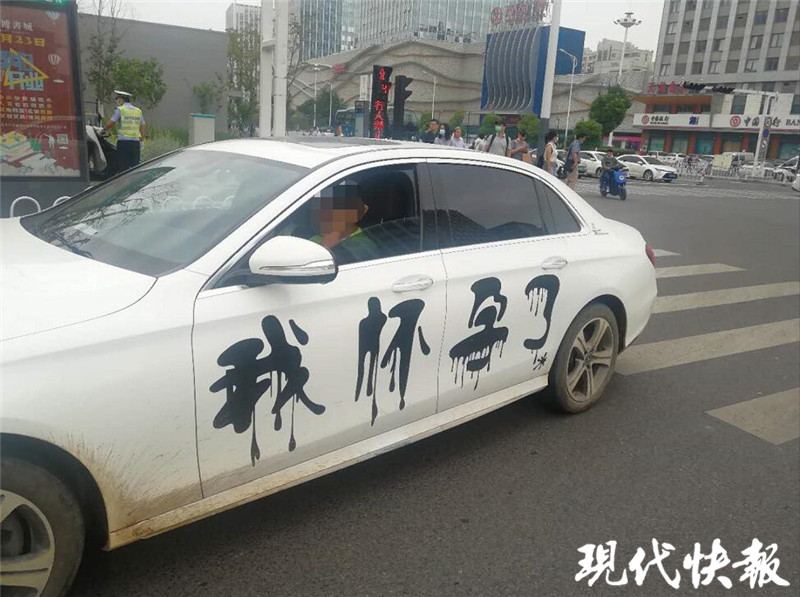 當(dāng)天上午,徐州云龍交警大隊(duì)五中隊(duì)民警在慶豐路與和平路交叉口執(zhí)勤期間,發(fā)現(xiàn)一輛白色奔馳車上赫然貼著“渣男”“我懷孕了”幾個(gè)大字。白車配上黑色大字,十分顯眼。隨即,民警讓其靠邊停車接受檢查。