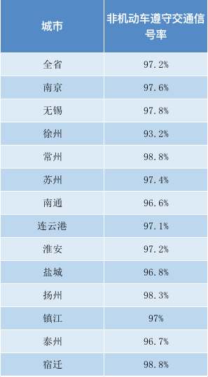 全省各地非機(jī)動車遵守交通信號燈率平均值為97.2%,常州、揚(yáng)州、宿遷等地非機(jī)動車遵守交通信號率均超過98%。
