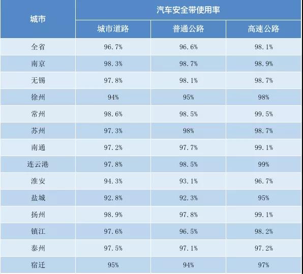 全省城市道路駕乘人員安全帶佩戴率平均值為96.7%,其中揚(yáng)州最高為98.9%;普通公路駕乘人員安全帶佩戴率平均值為96.6%,其中南京最高為98.7%;高速公路駕乘人員安全帶佩戴率平均值為98.1%,其中常州最高為99.5%。
