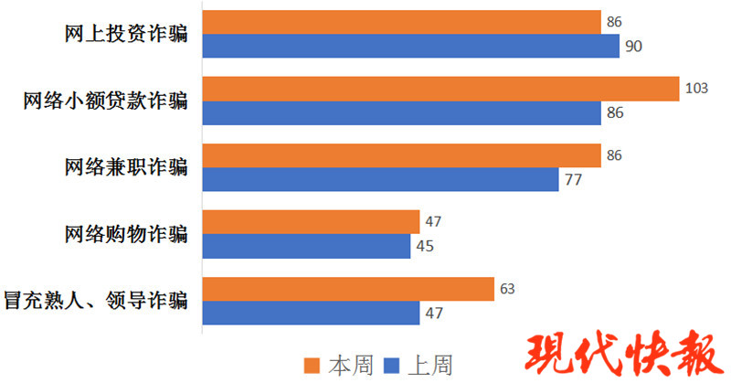 記者注意到,這5類詐騙手段,長期占據(jù)發(fā)案數(shù)量的前5位。例如,8月21日至27日一周,發(fā)案數(shù)量居前5位的分別是網(wǎng)上投資詐騙90起,網(wǎng)絡(luò)小額貸款詐騙86起,網(wǎng)絡(luò)兼職詐騙77起,冒充熟人、領(lǐng)導(dǎo)詐騙47起,網(wǎng)絡(luò)購物詐騙45起。8月14日至20日的一周,發(fā)案數(shù)量居前5位的,分別是網(wǎng)上投資詐騙109起,網(wǎng)絡(luò)小額貸款詐騙102起,網(wǎng)絡(luò)兼職詐騙70起,網(wǎng)絡(luò)購物詐騙51起,冒充熟人、領(lǐng)導(dǎo)詐騙28起。