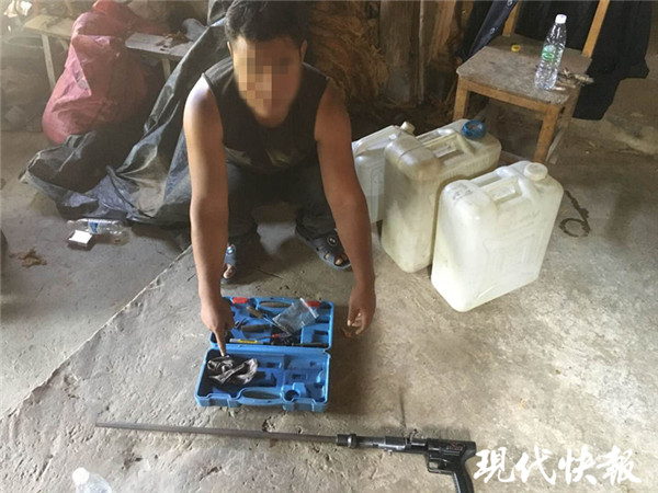 “名為射釘器,其實(shí)就是一支改造的火藥槍。”南通市公安局刑警支隊(duì)四大隊(duì)副大隊(duì)長(zhǎng)戴建峰說(shuō),該款射釘槍以用于生產(chǎn)工具的射釘器為主體,通過(guò)購(gòu)買(mǎi)相關(guān)配件進(jìn)行改裝,形成以火藥為動(dòng)力的火藥槍?zhuān)l(fā)射的彈丸速率最高達(dá)到510m/s,遠(yuǎn)遠(yuǎn)大于64式手槍彈320m/s的槍口速度,殺傷力強(qiáng)大。