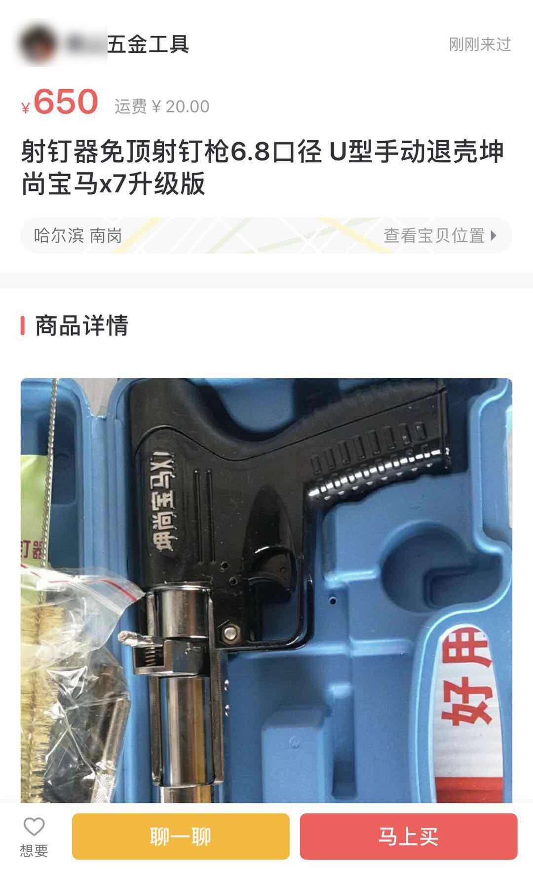 2019年4月,南通市公安局刑警支隊(duì)打擊網(wǎng)絡(luò)販槍工作專(zhuān)班通過(guò)網(wǎng)上巡查發(fā)現(xiàn),有人通過(guò)網(wǎng)絡(luò)非法渠道,購(gòu)買(mǎi)一款名為“坤尚寶馬x7免頂射釘器”的射釘槍?zhuān)⑦M(jìn)行改裝、制造火藥槍。