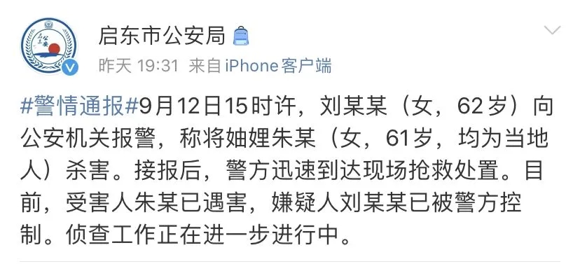 (記者 嚴(yán)君臣)9月12日晚,啟東市公安局通過官方微博發(fā)布一起警情通報。通報內(nèi)容顯示,9月12日15時許,劉某某(女,62歲)向公安機(jī)關(guān)報警,稱將妯娌朱某(女,61歲,均為當(dāng)?shù)厝?殺害。接報后,警方迅速到達(dá)現(xiàn)場搶救處置。