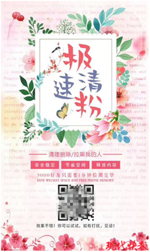 為圖省事和方便,部分微信用戶會選擇“清粉”服務。事后,有的用戶卻發(fā)現(xiàn)有陌生人通過自己分享的二維碼掃碼進群,或者自己被拉入了一些廣告群。今年6月,南通市公安局網(wǎng)安支隊民警在工作中發(fā)現(xiàn),部分微信朋友圈和群聊中散播的“清粉”軟件存在很大安全隱患。