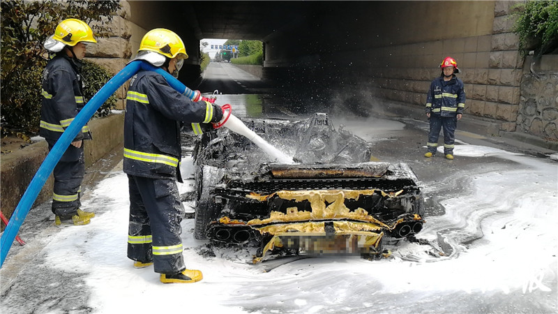 9月13日,在南京江北新區(qū)浦六路橋洞往南京長(zhǎng)江大橋方向,一輛蘭博基尼突然起火燃燒,現(xiàn)場(chǎng)濃煙滾滾。消防救援人員趕到現(xiàn)場(chǎng)時(shí),整個(gè)車身已經(jīng)被大火包圍,經(jīng)全力撲救,大火被撲滅,車身被燒毀嚴(yán)重,只剩下一個(gè)空架子。所幸,事故未造成人員傷亡。