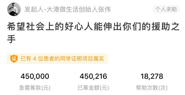 “希望孩子渡過難過,祝早日康復!”“星星之火,可以燎原……”“希望大家?guī)蛶退麄?,救救孩?”張偉告訴記者,事故發(fā)生后,自己在眾籌平臺上發(fā)起募捐,網(wǎng)友們紛紛慷慨解囊,并為孩子轉發(fā)祈福。捐款從15日晚上9:59分發(fā)起,截至16日下午13點06分,僅僅15個小時,就成功完成了45萬的目標額,總參與人次達18278人次。“這是網(wǎng)友們的力量創(chuàng)造的奇跡!”