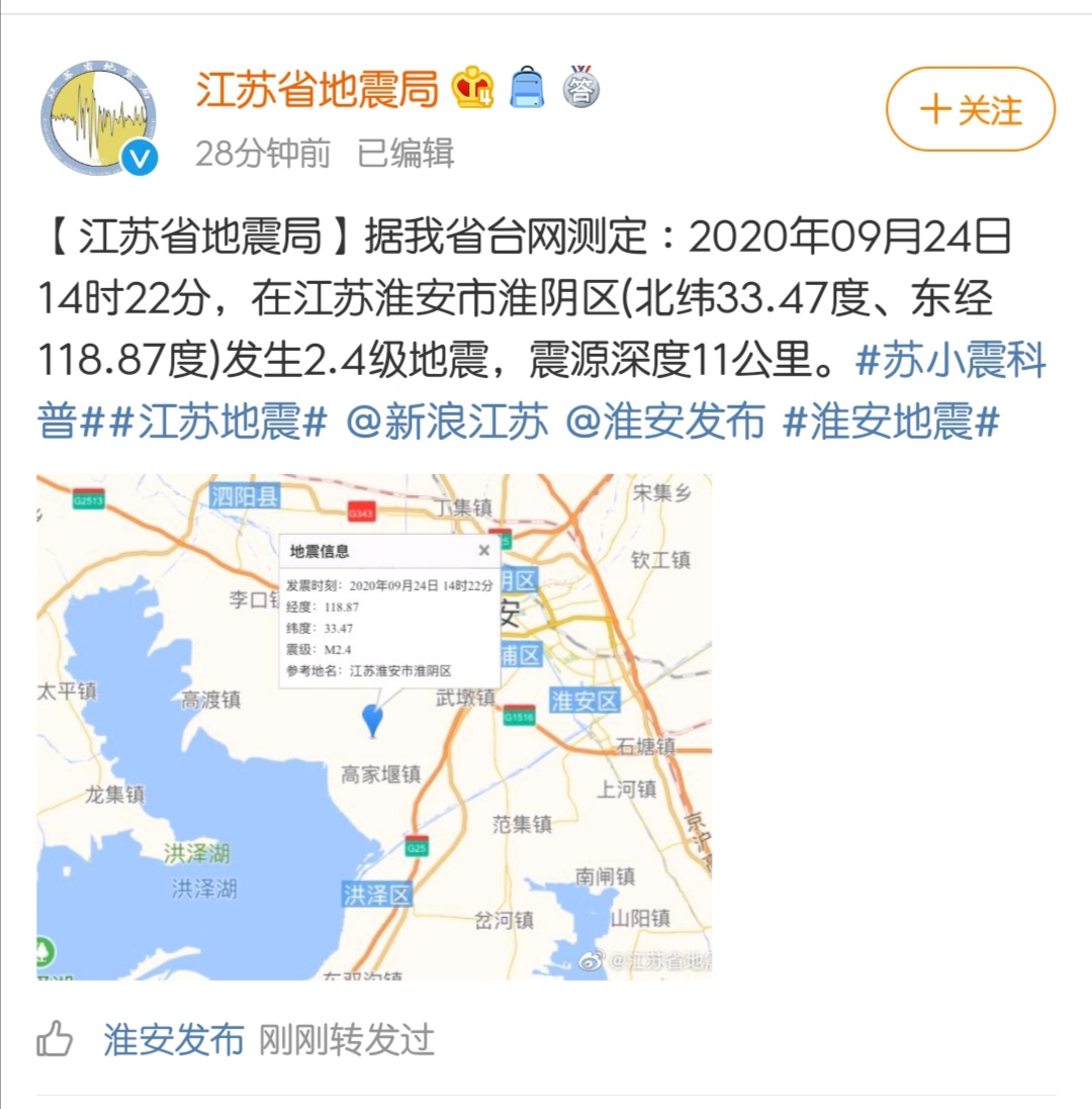淮安38分鐘連發(fā)2次地震 不少人稱有震感