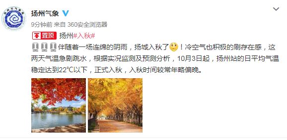 官宣:揚(yáng)州10月3日正式入秋!