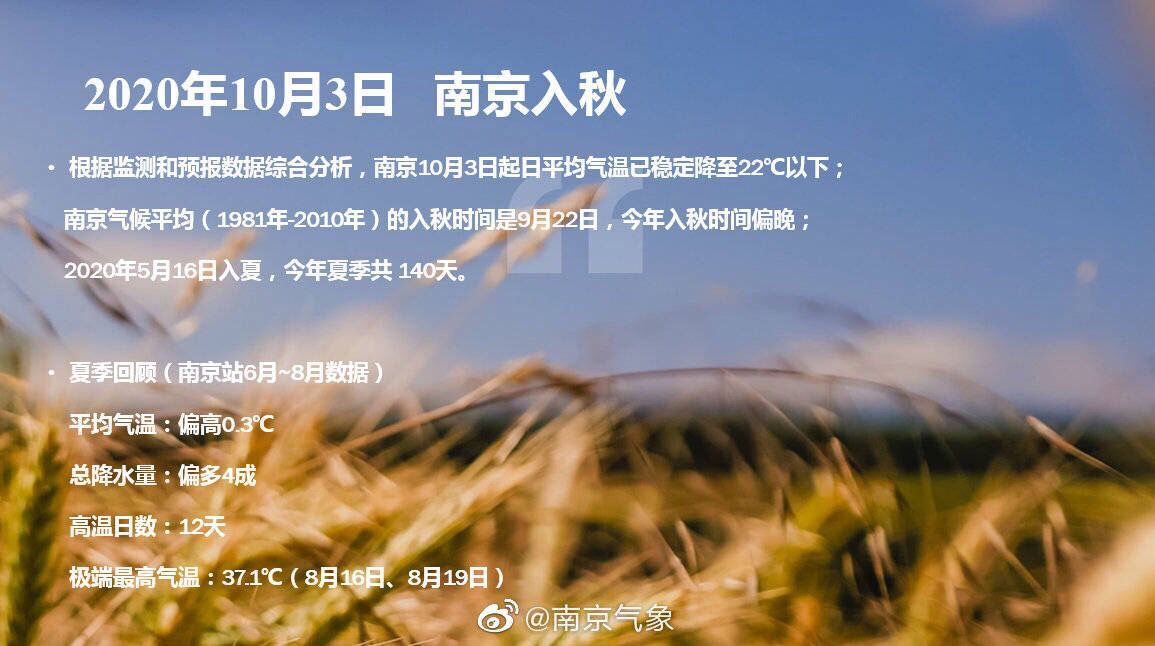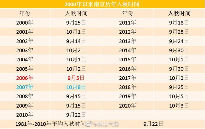 根據(jù)監(jiān)測和預(yù)報數(shù)據(jù)綜合分析,南京10月3日起日平均氣溫已穩(wěn)定降至22℃以下,于3日正式入秋。從往年看,南京氣候平均(1981年到2010年)的入秋時間是9月22日,今年入秋時間偏晚。2000年以來,南京最晚入秋時間出現(xiàn)在2007年10月8日,最早為2006年9月5日。今年是本世紀(jì)入秋第三晚。