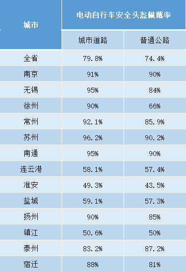 其中,城市道路和農(nóng)村道路電動自行車駕乘人員頭盔佩戴率均超過90%的城市是:南京、蘇州、南通三市。
