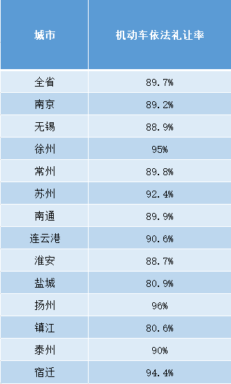 全省各地機動車依法禮讓率平均值為89.7%,其中徐州、揚州機動車依法禮讓率均達95%以上。