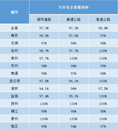 全省城市道路駕乘人員安全帶佩戴率平均值為97.2%,其中揚州、泰州使用率達100%;普通公路駕乘人員安全帶佩戴率平均值為97.3%,其中常州、揚州、泰州使用率達100%;高速公路駕乘人員安全帶佩戴率平均值為98.8%,其徐州、常州、連云港、鹽城、揚州、泰州使用率達100%