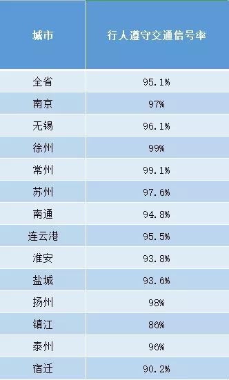全省各地行人遵守交通信號率平均值為95.1%,南京、徐州、常州、蘇州、揚州等地行人遵守交通信號率均超過97%。