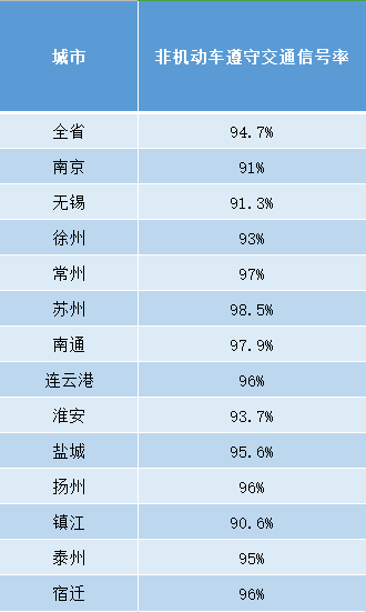 全省各地非機動車遵守交通信號燈率平均值為94.7%,常州、蘇州、南通等地非機動車遵守交通信號率均超過97%。