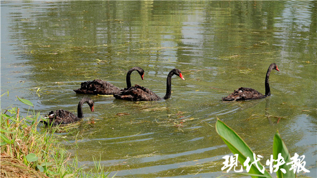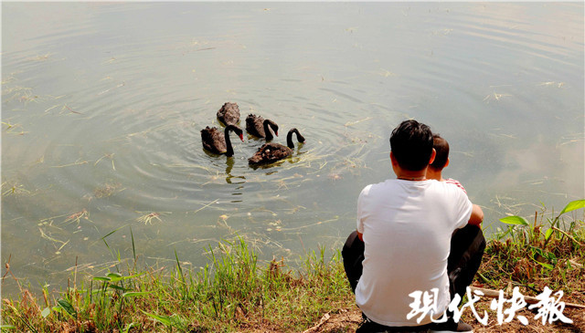 10月11日,現(xiàn)代快報記者來到燕雀湖邊,看到4只黑天鵝在這里“定居”。它們在波光粼粼的湖面上游來游去,覓食嬉戲,不時發(fā)出一聲聲鳴叫,仿佛在與游人“打招呼”,逗得孩子們合不攏嘴。