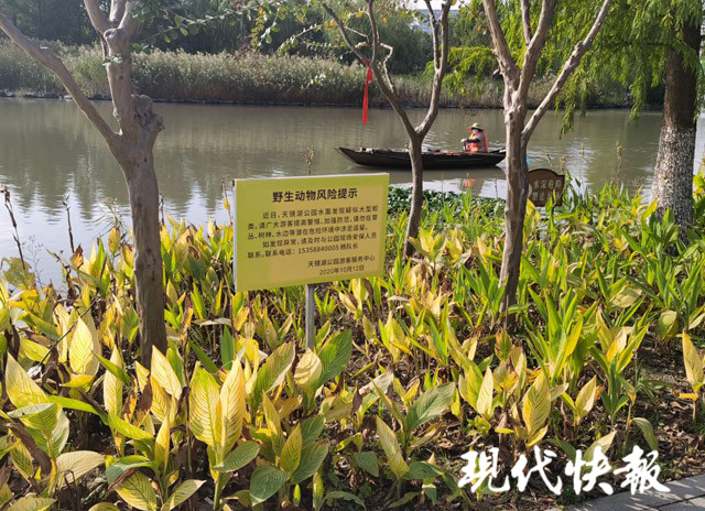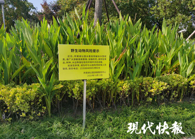 黃底色的“野生動(dòng)物風(fēng)險(xiǎn)提示”標(biāo)牌隨處可見,提醒游客勿在草叢、樹林、水邊涉足逗留,有異常情況可聯(lián)絡(luò)園內(nèi)安保。記者注意到,這些安全提示牌的落款時(shí)間為10月12日——湖面“蛇影”出現(xiàn)的14天后。