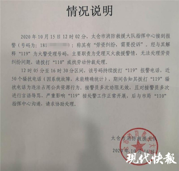 現(xiàn)代快報記者了解到,太倉市消防救援大隊日前發(fā)布了一則情況說明,10月15日12時02分至16時30分之間,張某(男,47歲,江蘇贛榆人)在飲酒后,借稱有“勞資糾紛需要投訴”,連續(xù)撥打119報警電話近50個,嚴重影響了消防工作的正常開展。