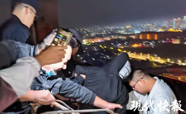 “別動,這里很危險,我們過來救你。”看到小李后,徐世杰和同事順著狹窄陡峭的鐵梯爬到對方身邊,此時小李體溫降低、渾身顫抖。民警和到場的醫(yī)護人員一邊安撫小李情緒,一邊做好安全防護措施,第一時間將小李轉(zhuǎn)移到樓下,抬上救護車送往醫(yī)院。